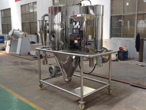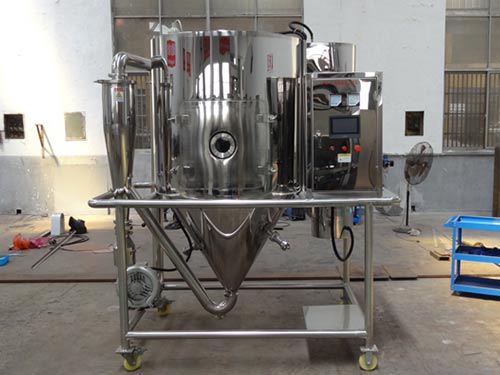 空氣經(jīng)過(guò)濾和加熱,進(jìn)入干燥器頂部空氣分配器,熱空氣呈螺旋狀均勻地進(jìn)入干燥室。料液經(jīng)塔體頂部的高速離心霧化器,(旋轉(zhuǎn))噴霧成極細(xì)微的霧狀液珠,與熱空氣并流接觸在極短的時(shí)間內(nèi)可干燥為成品。成品連續(xù)地由干燥塔底部和旋風(fēng)分離器中輸出,廢氣由風(fēng)機(jī)排空。