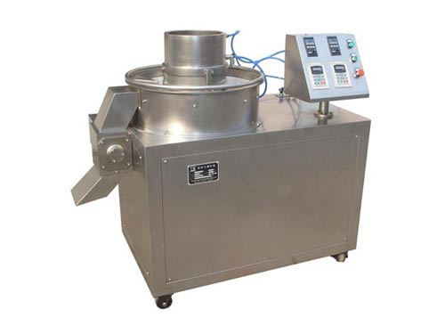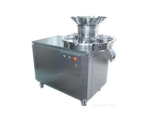 本機由一組相對旋轉(zhuǎn)碾刀,通過不銹鋼篩筒的孔將微潮濕的粉料碾擠成顆粒,也可粉碎廢片和干塊并碾擠成顆粒。該機適用于制藥工業(yè),同時也適用于食品、電子等行業(yè)。本機與物料接觸的零件全部采用不銹鋼制成,機體外殼用不銹鋼封閉,清潔保養(yǎng)方便。該機適用于物料粘性高,其它機難制粒,本機即可使用.