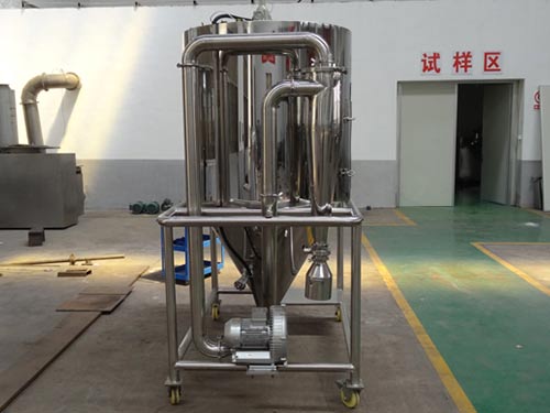 空氣經(jīng)過(guò)濾和加熱,進(jìn)入干燥器頂部空氣分配器,熱空氣呈螺旋狀均勻地進(jìn)入干燥室。料液經(jīng)塔體頂部的高速離心霧化器,(旋轉(zhuǎn))噴霧成極細(xì)微的霧狀液珠,與熱空氣并流接觸在極短的時(shí)間內(nèi)可干燥為成品。成品連續(xù)地由干燥塔底部和旋風(fēng)分離器中輸出,廢氣由風(fēng)機(jī)排空。
